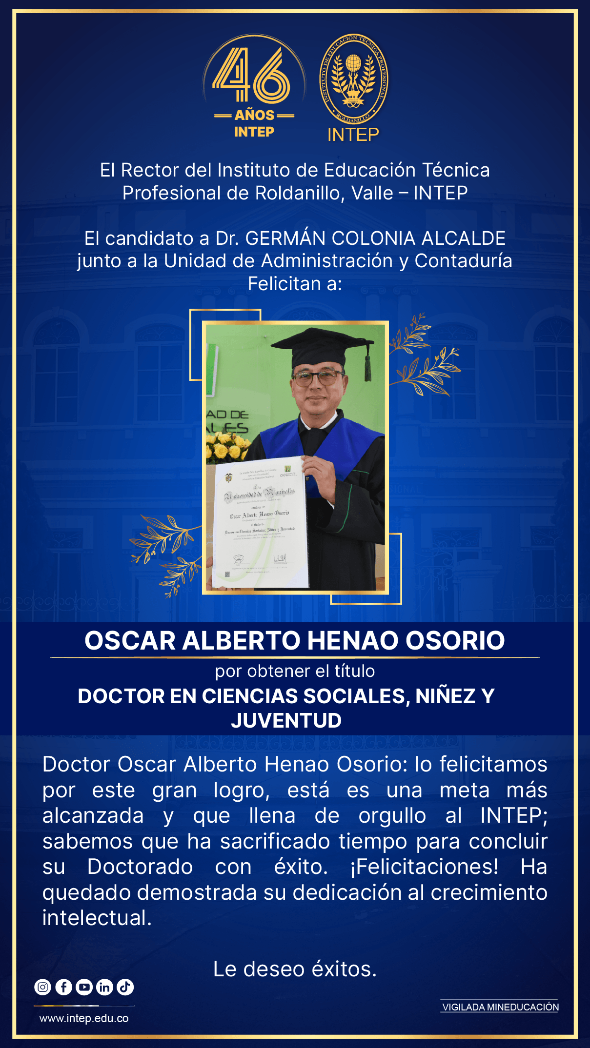 El rector del INTEP y la UnIdad de Administración y Contaduria, felicitan con orgullo a nuestro DocenteI NTEP Oscar Alberto Henao Osorio.