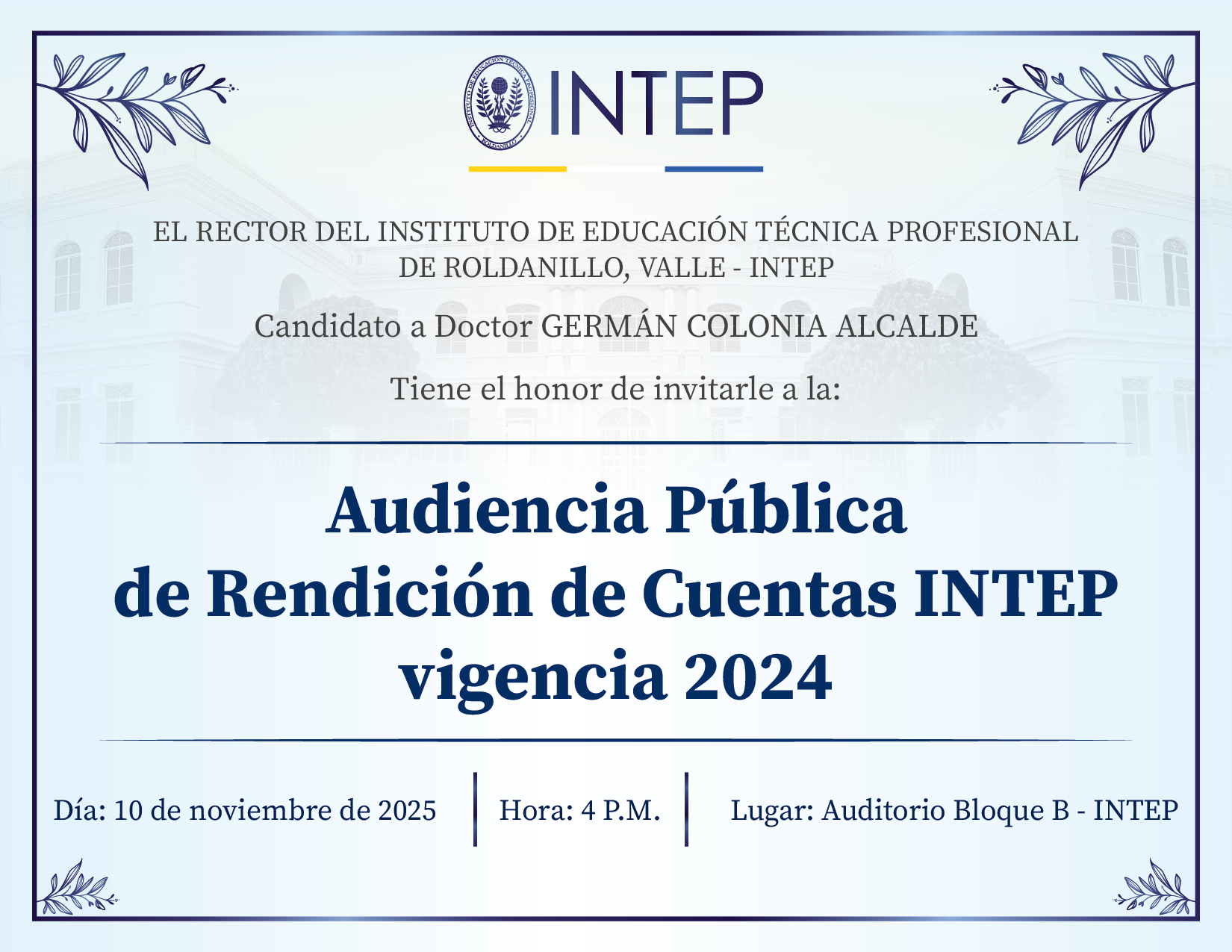 El señor Rector del Instituto de Educación Técnica Profesional de Roldanillo, Valle - INTEP, candidato a Doctor, Germán Colonia Alcalde, se complace en invitarle a la Audiencia Pública de Rendición de Cuentas Vigencia 2024, a realizarse el día de hoy, 10 de noviembre de 2025.