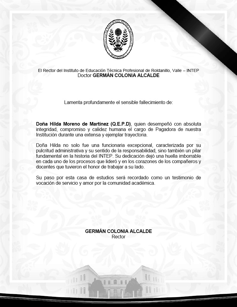 El Rector del Instituto de Educación Técnica Profesional de Roldanillo, Valle - INTEP, Doctor GERMÁN COLONIA ALCALDE. Lamenta profundamente: El sensible fallecimiento de Doña Hilda Moreno de Martínez.Read More