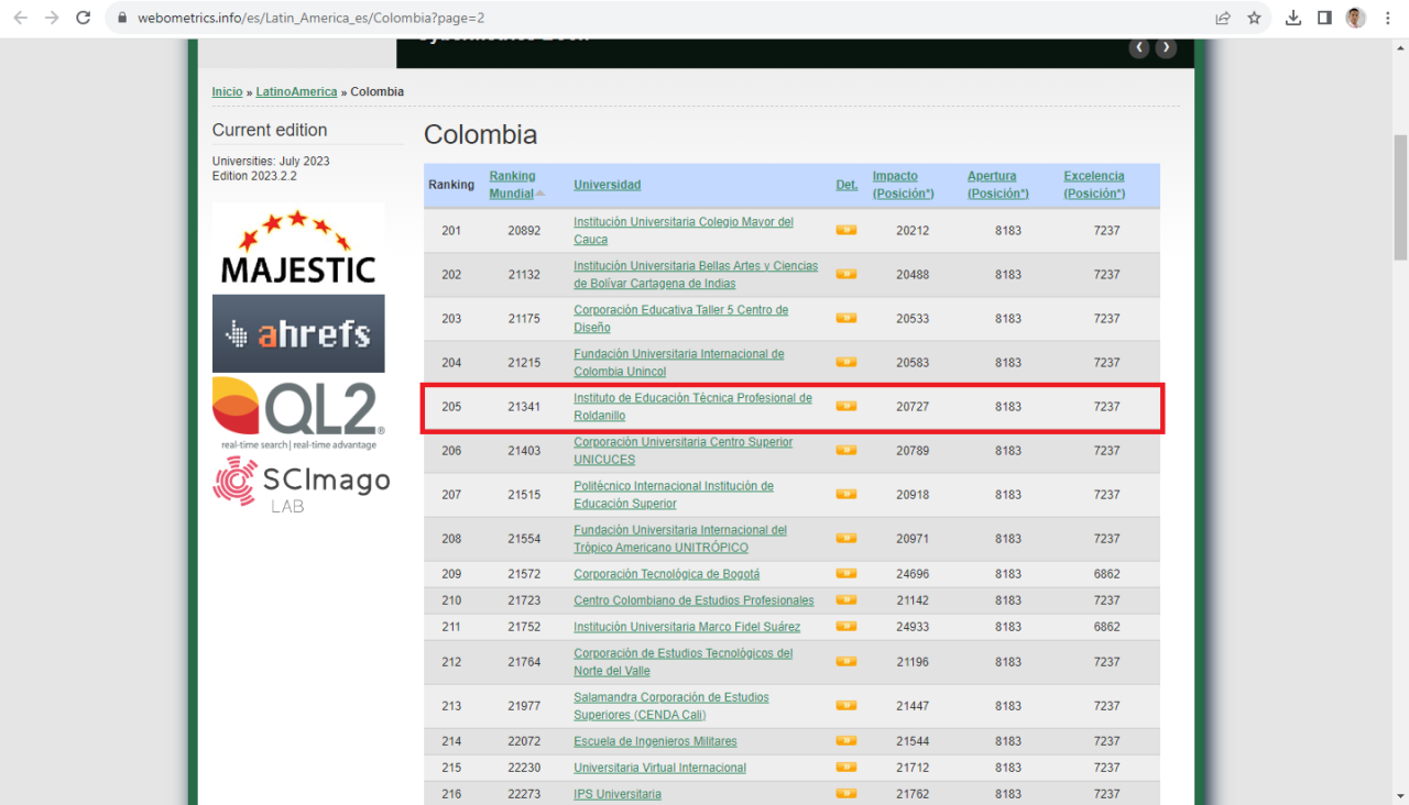 Fuente: Ranking Web de Universidades – Ranking del INTEP, posición 205 a Julio de 2023. Recuperado Ranking Web de Universidades, 31 de noviembre de 2023.