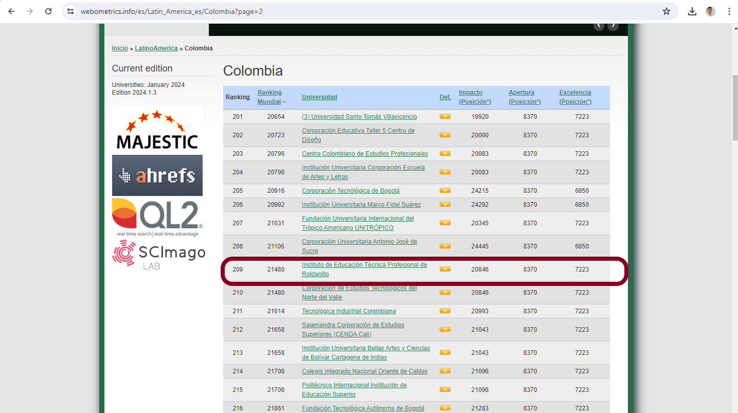 Fuente: Ranking Web de Universidades – Ranking del INTEP, posición 209 a Enero de 2024. Recuperado Ranking Web de Universidades, 29 de abril de 2024.
