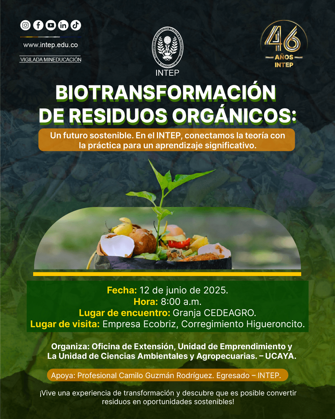 La Oficina de Extensión, la Unidad de Emprendimiento y la Unidad de Ciencias Ambientales y Agropecuarias desarrollan proyectos conjuntos; en esta oportunidad en el marco del proyecto «Biotransformación de residuos agrícolas y pecuarios para la producción de abonos orgánicos» en el cuál participan 20 personas de los talleres teóricos de lombricompostaje, tendrán una experiencia práctica en la empresa Ecobriz.