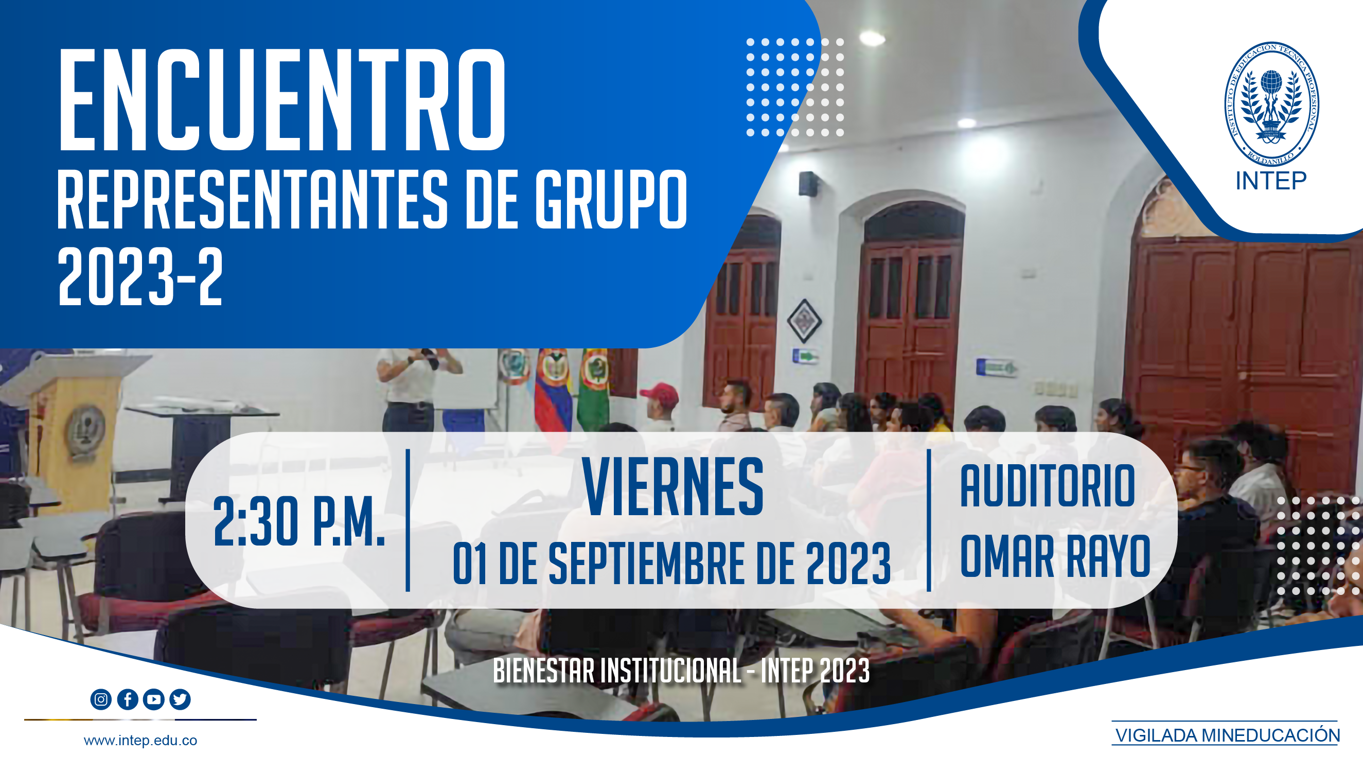 Bienestar Institucional y Vicerrectoría Académica convocan a los Representantes de Grupo del INTEP de los diferentes Programas Académicos de la Institución con el fin de darles la bienvenida al período académico 2023-2 así mismo presentarles los proyectos y actividades que se están ejecutando y que se tienen planteadas para este semestre.