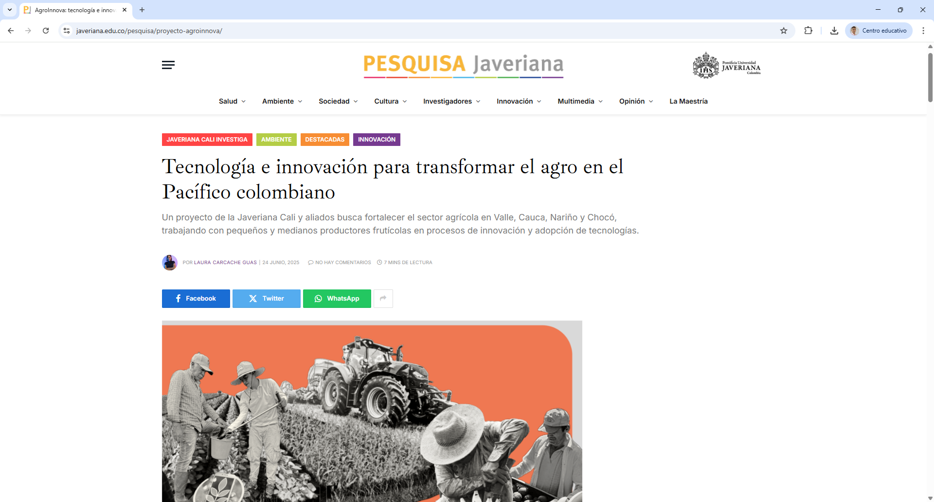 En esta edición se destaca el proyecto AgroInnova, una alianza estratégica entre la Pontificia Universidad Javeriana seccional Cali, la Gobernación del Valle del Cauca, el Instituto de Educación Técnica Profesional de Roldanillo -INTEP, la empresa Buxtar y Corpovalle. Esta articulación entre academia, gobierno, industria y sociedad civil, con financiación del Sistema General de Regalías, trabaja por la sostenibilidad agrícola de la Región Pacífico de Colombia. Su propósito es fortalecer la innovación y el uso de tecnologías en los procesos productivos de pequeños y medianos productores frutícolas de Valle del Cauca, Chocó, Nariño y Cauca, contribuyendo a mejorar su productividad y sostenibilidad.