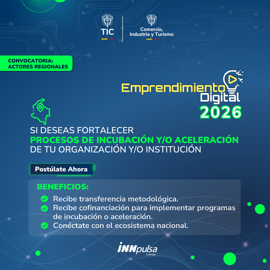 Emprendimiento Digital es una iniciativa del Ministerio de las Tecnologías de la Información y las Comunicaciones, que tiene como propósito promover el desarrollo de Ecosistemas de Emprendimiento e Innovación Digital, mediante el fortalecimiento de capacidades de actores regionales y de empresas de la industria digital. En el marco de esta iniciativa, se abre la presente convocatoria que tiene como objetivo fortalecer las capacidades de los actores regionales del Ecosistema de Emprendimiento e Innovación Digital, mediante procesos de acompañamiento y transferencia metodológica que les permitan desarrollar o fortalecer programas de incubación o aceleración en sus territorios. A través de este proceso se busca impulsar el desarrollo de equipos emprendedores y empresas digitales, promover la generación de capacidades en los territorios y fortalecer los ecosistemas regionales de emprendimiento e innovación digital en el país.
