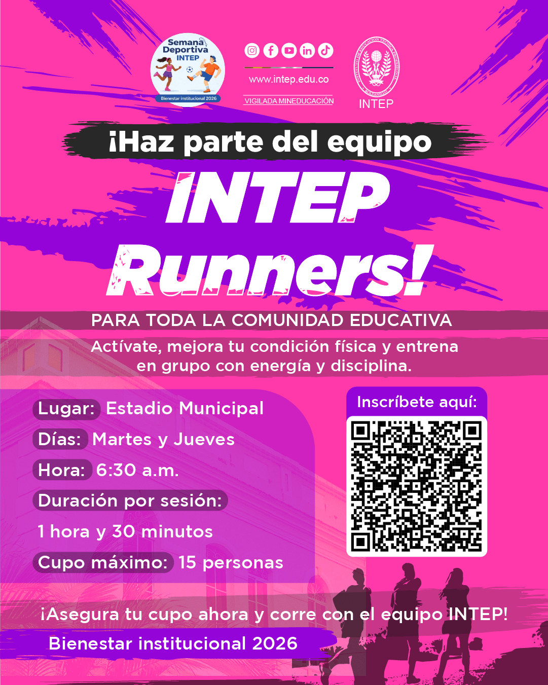 Súmate a INTEP Runners y comienza tus mañanas con energía, disciplina y bienestar. Entrena en equipo, mejora tu condición física y vive la experiencia de correr juntos. ¡Inscríbete y asegura tu cupo!