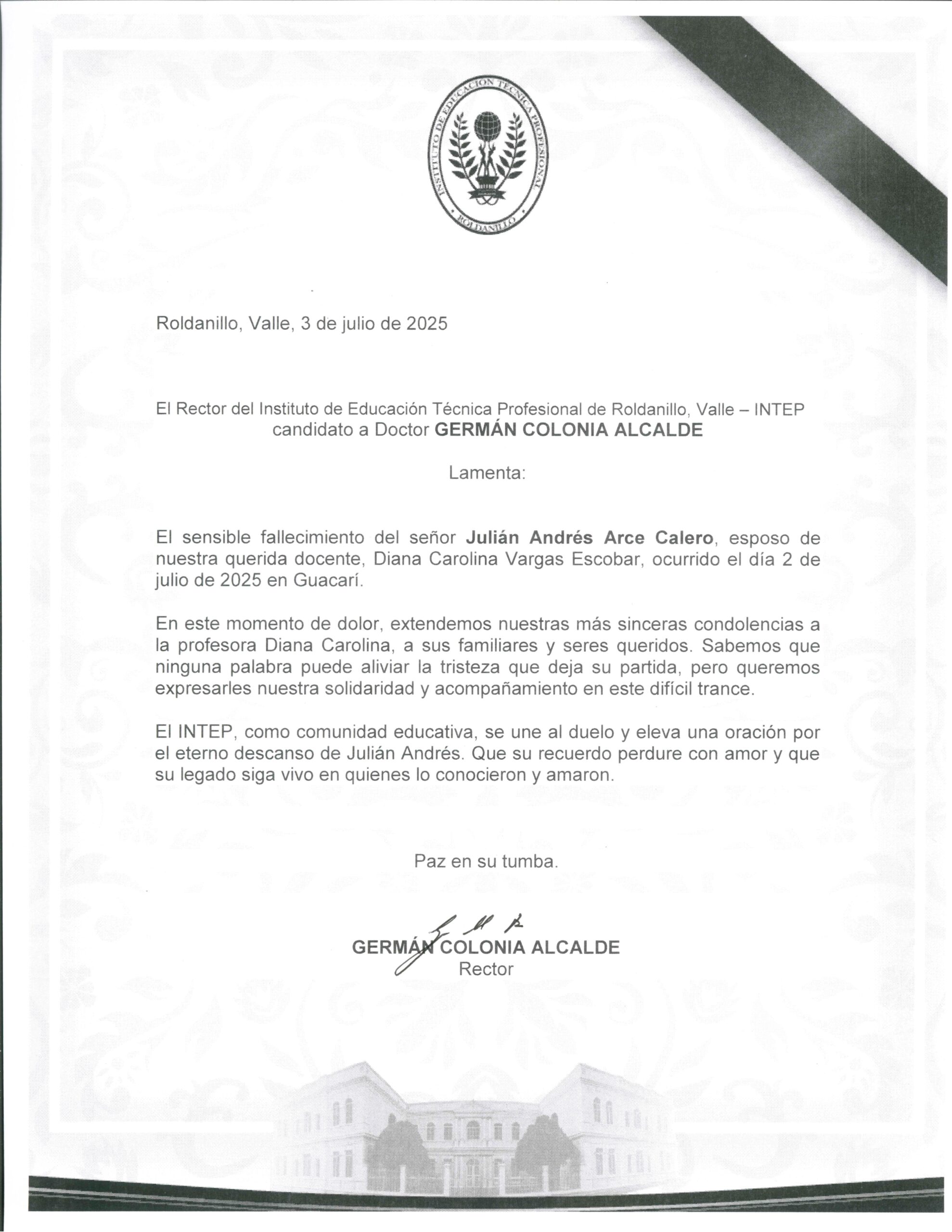 Mensaje de Condolencias / Julián Andrés Calero