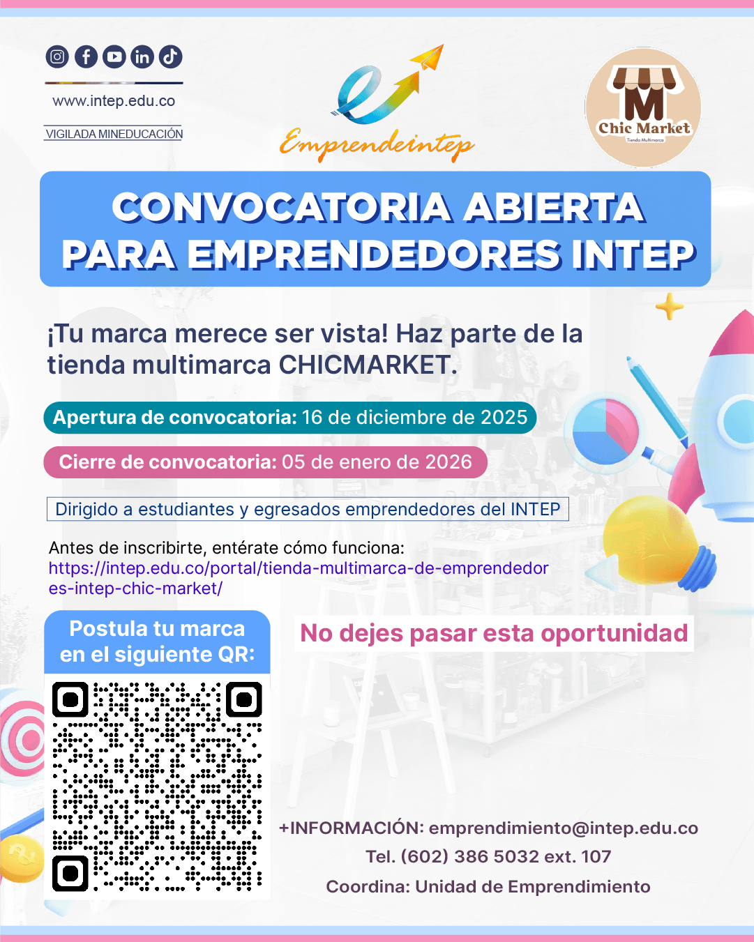 El INTEP fortalece el talento emprendedor con la inauguración de nuevas marcas en la tienda multimarca CHIC MARKET. Estudiantes y egresados del Instituto de Educación Técnica Profesional de Roldanillo encuentran en este espacio una vitrina real para visibilizar y comercializar sus productos, fortaleciendo el ecosistema emprendedor del norte del Valle del Cauca.
