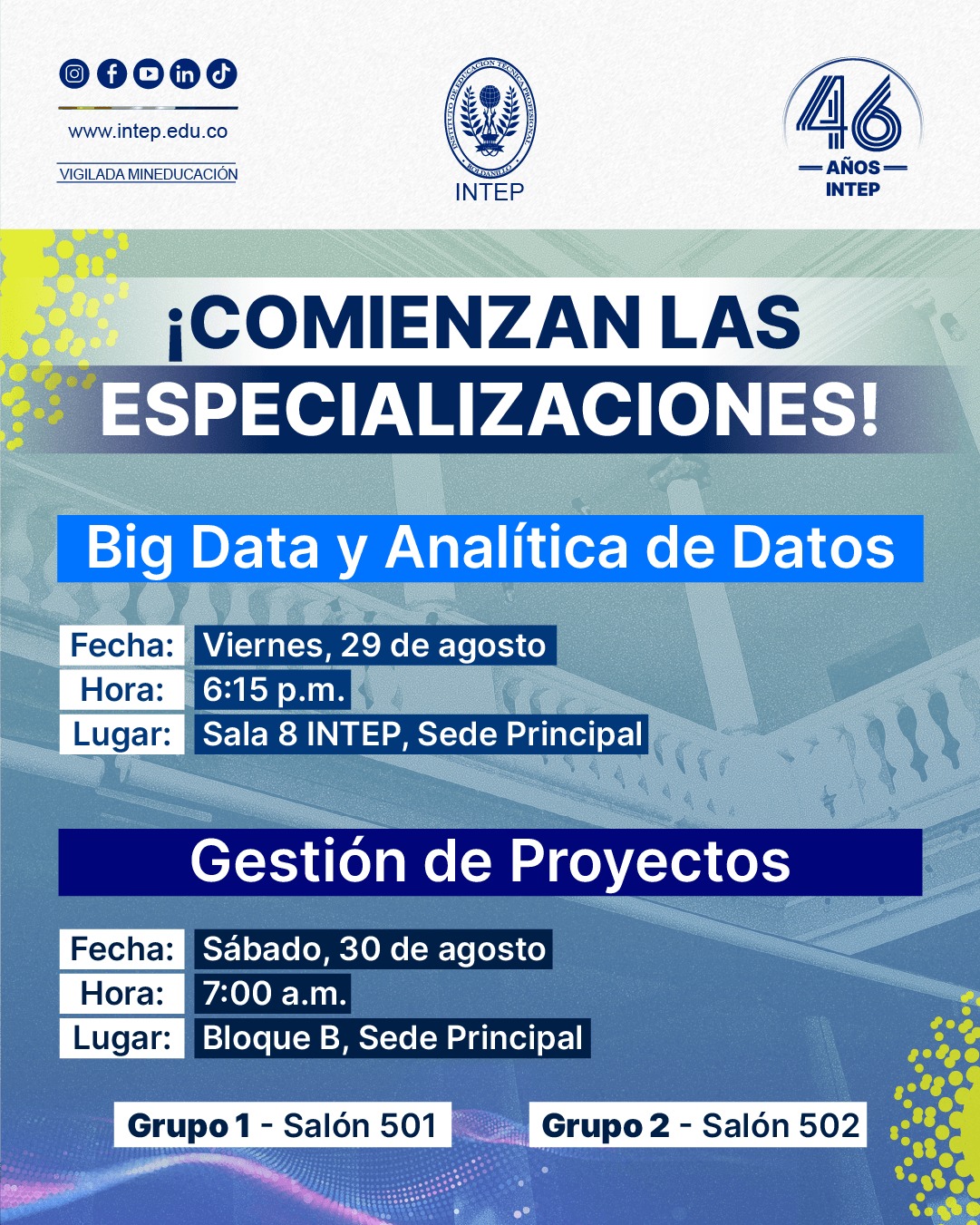 Nos complace informar que comienzan las especializaciones en Gestión de Proyectos y Big Data y Analítica de Datos, les compartimos las fechas y horarios.