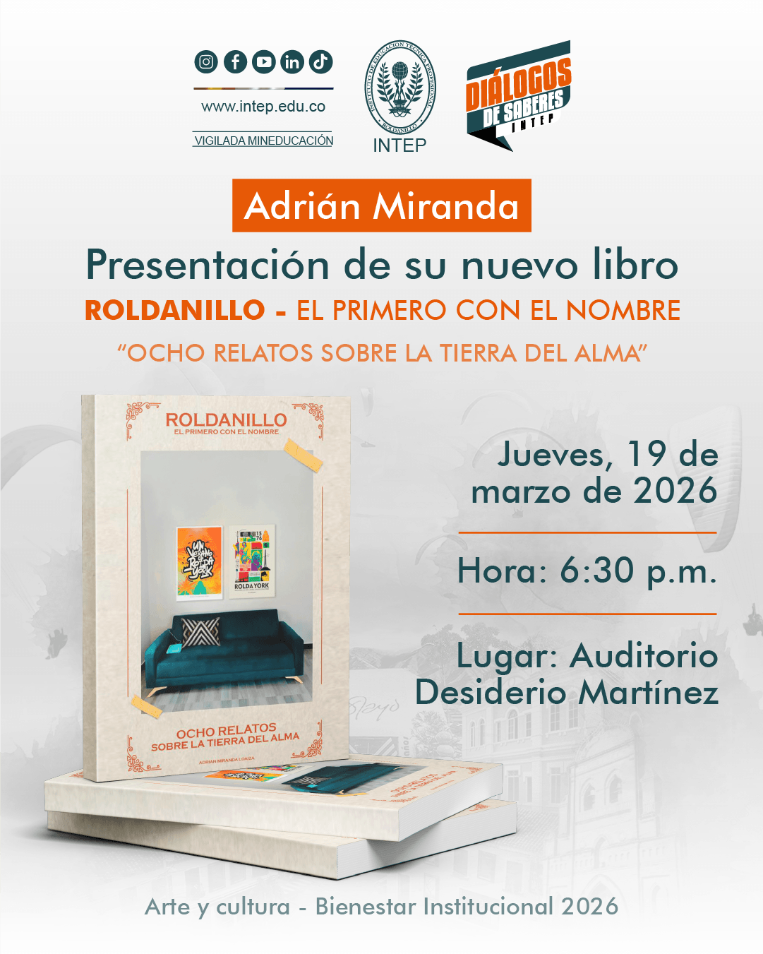 Invitamos a toda la comunidad institucional a la Presentación del Libro🎙️Roldanillo, el primero con el nombre: Ocho relatos sobre la Tierra del Alma. ( Recoge ocho cuentos que proponen como escenario el municipio de Roldanillo, Valle del Cauca.) Autor: Adrián Miranda.