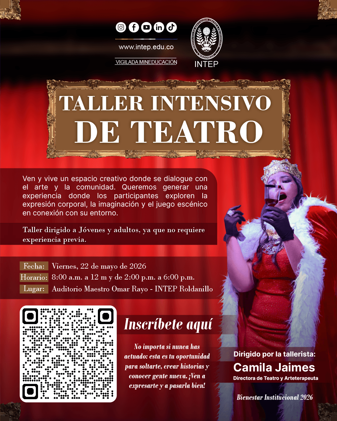 Te invitamos a participar en nuestro Taller Intensivo de Teatro🎬, un espacio para desarrollar la expresión corporal, la creatividad, la confianza y el trabajo en equipo.